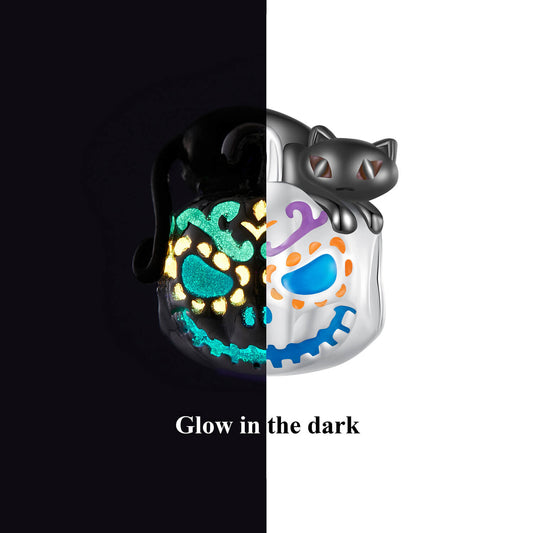 Glow-in-the-dark Black Cat Pumpkin Lantern Sterling Silver Charm