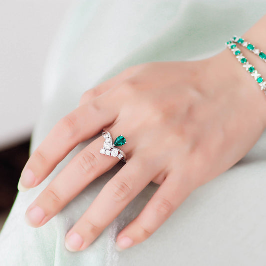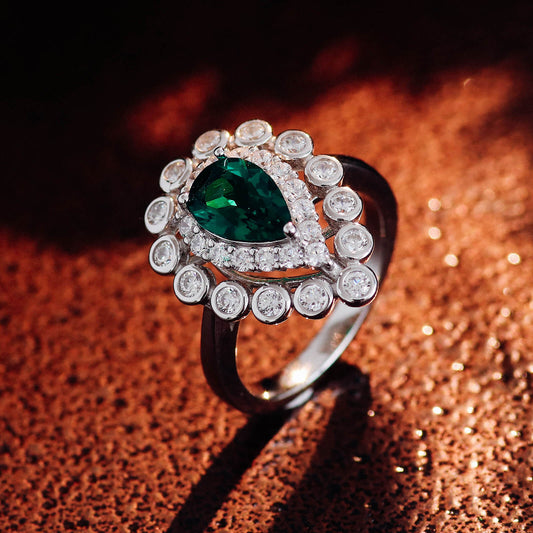 FEELIVE Crown Drop Lab Create Emerald Silver Ring (0.7 ct Pear Moissanite)