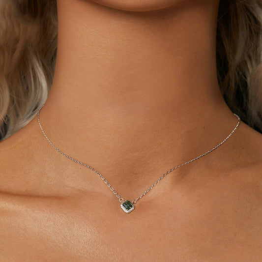 Green Asscher Moissanite Sugar Cube Pendant Silver Necklace