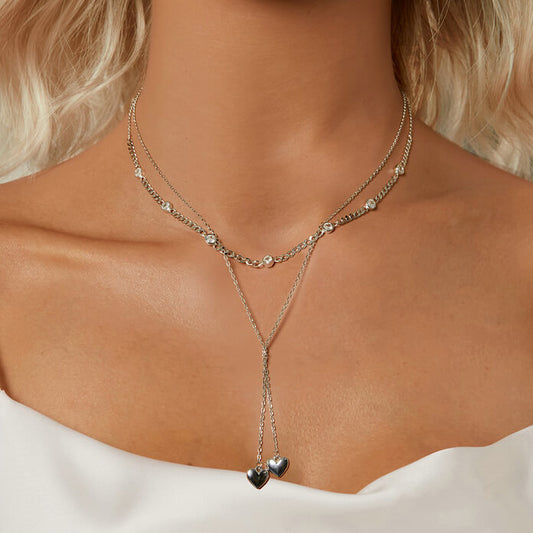 Double Heart Spliced Chain Sterling Silver Layered Sweater Necklace