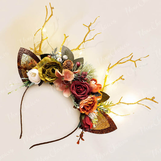 FEELIVE Glowing Simulated Reindeer Antler Garden Blush & Golden Leaves Headband【Free Gift Box】
