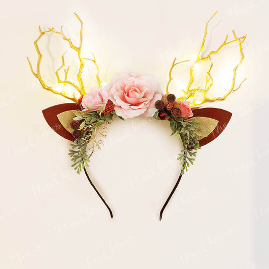 FEELIVE Glowing Simulated Reindeer Antler Rose and Cream Headband【Free Gift Box】