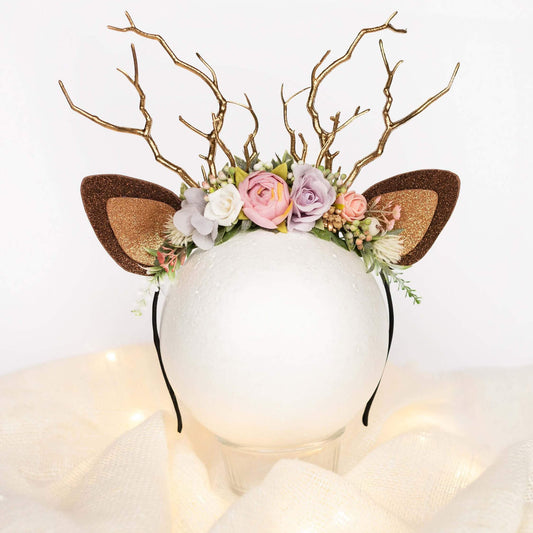 FEELIVE Glowing Simulated Reindeer Antler Lavender Aster & Rose Garden Headband【Free Gift Box】