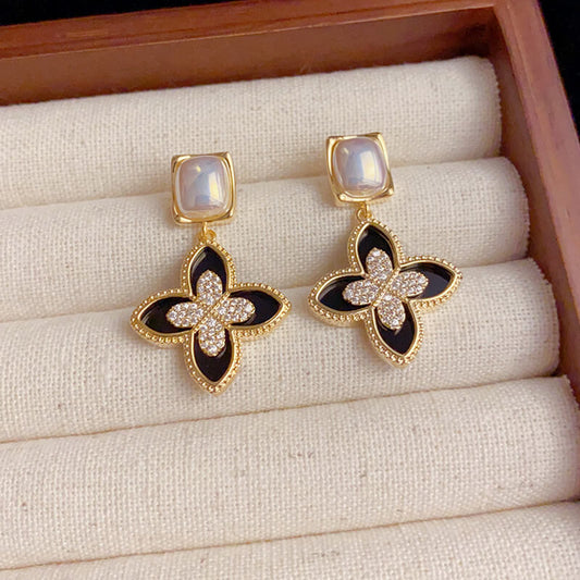 FEELIVE Luxurious Lucky Black Clover Pearl Drop Earrings