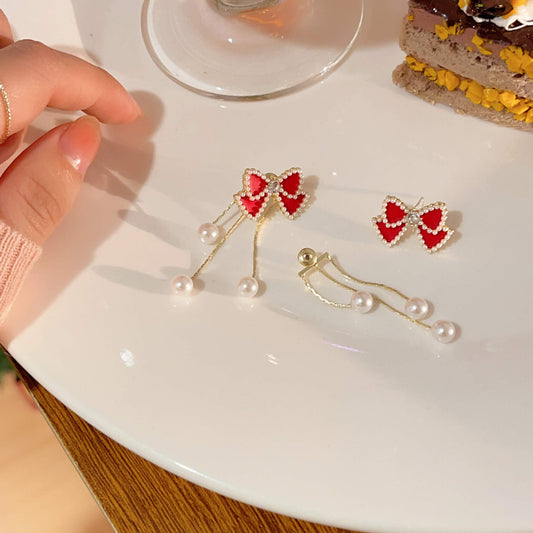FEELIVE Detachable Sweet Style Red Bow Pearl Tassel Earrings